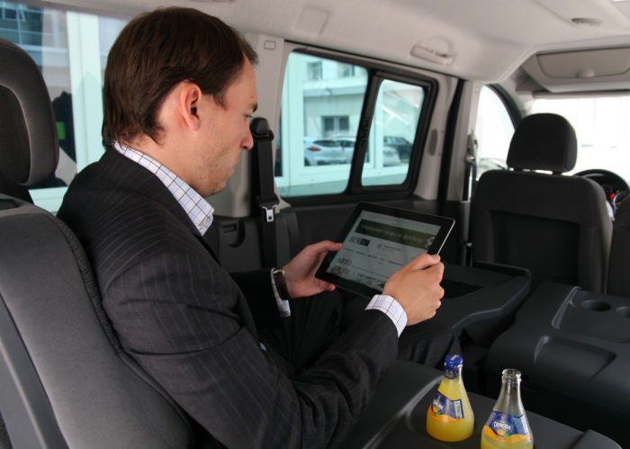 Гости с комфортом расположились в FIAT Scudo и, заметив, что второй ряд чудесным образом превратился в дополнительный столик, тут же достали ноутбук и стали рассказывать о совместном проекте. Работа началась прямо в офисе на колесах под именем FIAT Scudo.