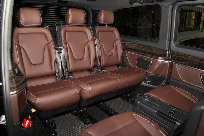 Наш Mercedes-Benz V-Класс рассчитан на 6 пассажиров. Один располагается спереди, трое на диване на третьем ряду и двое на раздельных креслах лицом к пассажирам третьего ряда. Такая компоновка, помимо прочего, позволяет сохранить достаточно места в багажном отсеке.