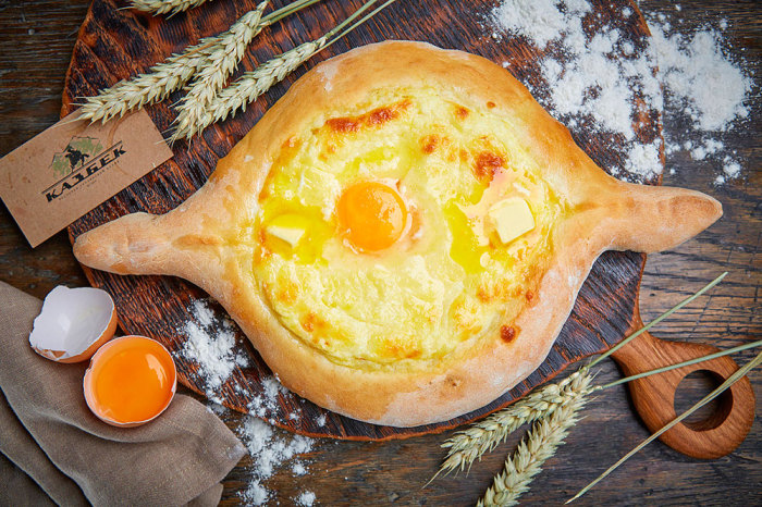 Много дневного света, искусно состаренные стены, резные деревянные ширмы, фактурные полы, но главное — огромная, встроенная в роскошный буфет, настоящая дровяная печь, в которой выпекаются хачапури и хлеб, и окна, выходящие прямиком на кухню ресторана, где всеми процессами руководит молодой голубоглазый шеф-тбилисец Мамия Джоджуа вместе со своей матушкой.