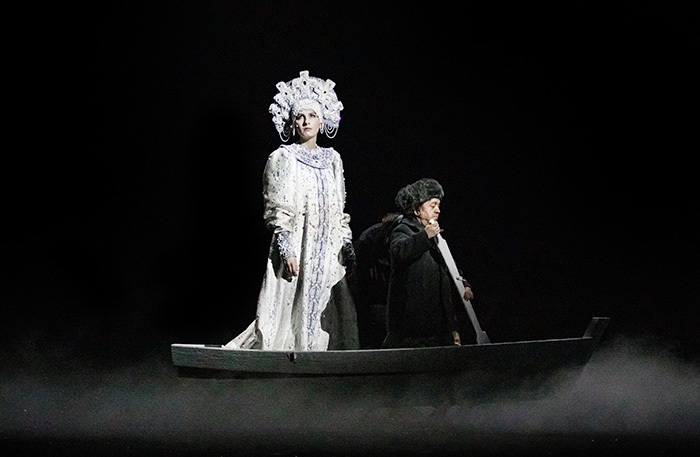Туман, по темной сцене плывет лодка с красавицей-Снегурочкой — это один из образов молодой актрисы Муси Тотибадзе. На авансцене в папахе с ружьем сидит Лия Ахеджакова. Несколько занавесов, эффектные граффити мелом, стволы берез, которые вдруг «опускаются» в антураж больницы, старый автомобиль мчит в Минск по какой-то бесконечной, проецируемой на декорации дороге.