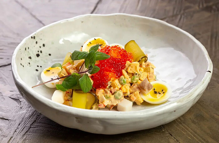 Отдельно скажу про оливье. Здесь его готовят с соей кабуль. Это соус, который упоминается в классическом рецепте салата оливье XIX века. В XIX веке лучшей считалась привозная, английская. Рецепт утерян как у англичан, так и у нас после революции. Сейчас экспериментируют наши производители. Секрет, естественно, не выдается. Мы, попросив с кухни этой сои кабуль «чистоганом», насчитали, на наш вкус, 27 видов всяких специй, а также томатную пасту, мадеру и ферментированную свеклу.