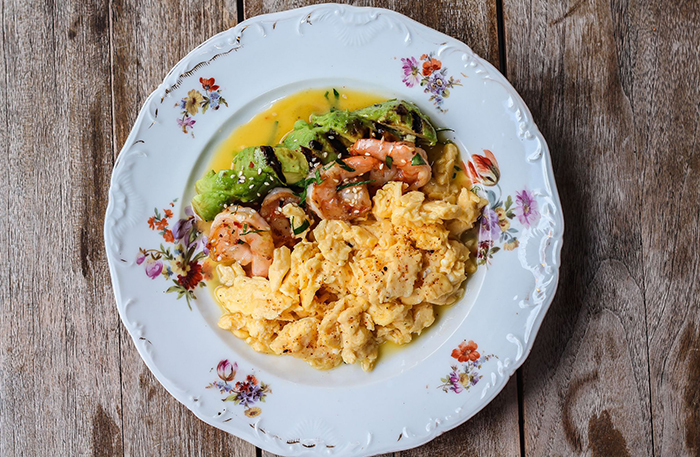 Скрэмбл с креветками и авокадо. В скрэмбл добавляют сметану, поэтому он получается нежный и шелковистый. Авокадо обжаривается на гриле и сверху украшается кунжутными семечками — трогательное внимание к деталям. Креветки готовятся в соусе биск. Я не очень люблю креветки, особенно в омлете, особенно после того, как узнала, что японцы называют их «морскими тараканами», но если вы не так впечатлительны и любите скрэмбл с креветками, это блюдо стоит брать.