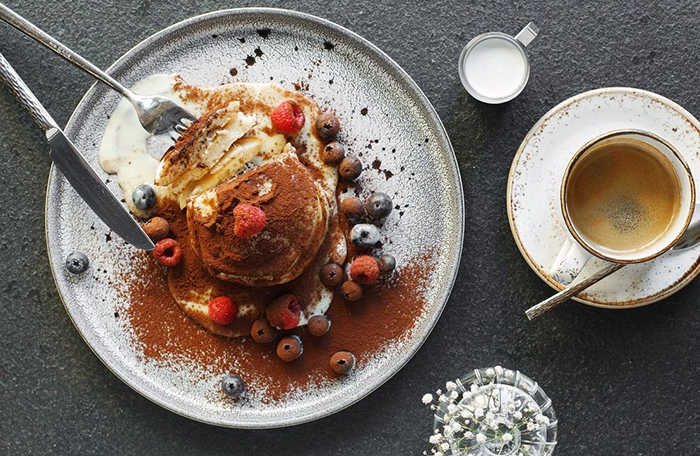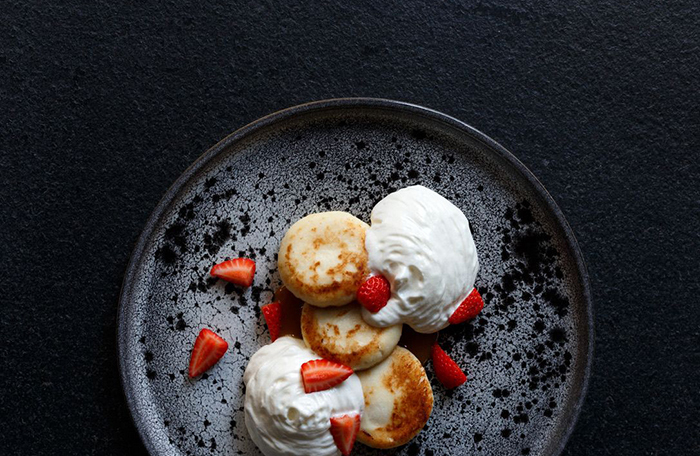 С детства любимое блюдо шефа — сладкие оладушки: пышные, с щедрыми ягодами и с фирменной домашней сгущенкой. Уверена, если вы будете с детьми, их от оладушек будет не оторвать.