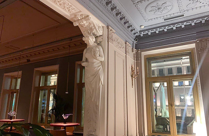 Многие бары в Петербурге работают с четверга по субботу с 18:00, так что надо успеть посетить как можно больше мест. Выйдя из «Кабинета», направилась в Merula (Невский проспект, 47) — давно хотела попасть в это питейное царство в лепнине. Но как же не зайти в любимую шавермичную на углу Невского и Литейного проспектов по дороге? Даже в 1:30 ночи в знаменитой шавермичной полно народу. Закусив невообразимым счастьем, а именно шавермой в лаваше с фееричным йогуртово-чесночным соусом, я отправилась в царство лепнины. Ожидания оправдались: в Merula есть и кариатиды, и роспись в залах. Заведением управляют молодые ребята, и они не сумели вспомнить увлекательные истории для меня, даже о ресторане. Все-таки в питейных Петербурга предполагаются байки, интересные диалоги и приключения, о которых смешно вспоминать, глядя в телефон на следующее утро. Но в Merula хорошая подборка вин, так что, если вы мечтаете о тихом вечере с бокалом в руках, вам понравится.
