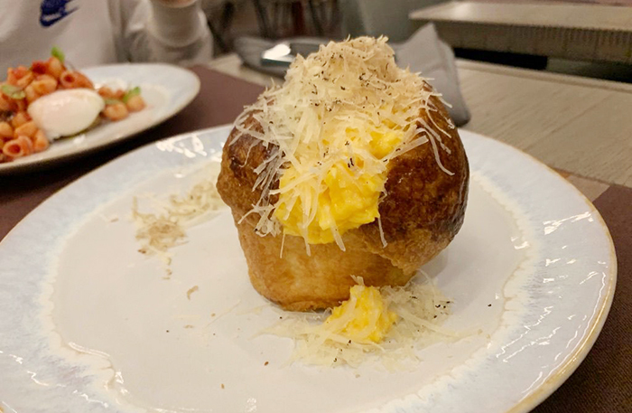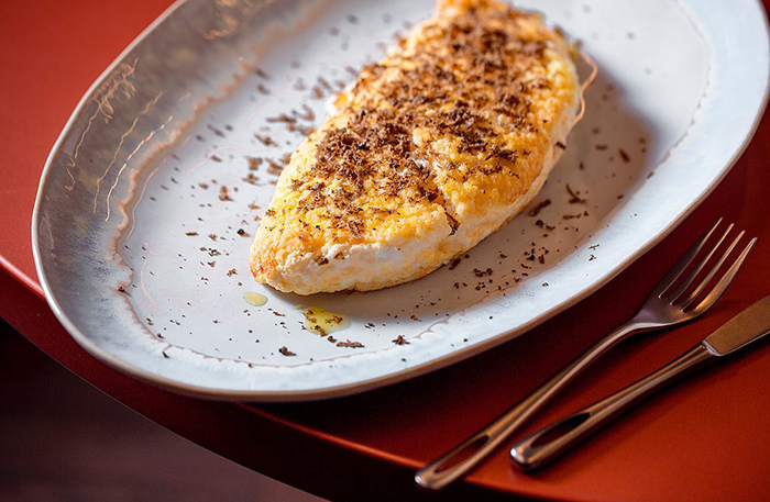 Cлоеная булочка со скрэмблом и черным трюфелем (660 рублей) в хит-парад не вошла, хотя подача для Москвы очень необычна. Но с булочкой в этот раз было что-то не то: невкусная и твердоватая. Сам скрэмбл хорош, правильной консистенции, Cremette (крем-чиз) взбивается со сметаной и отлично дополняет скрэмбл (хозяйке на заметку, как снизить процент жирности в крем-чизе и заодно сделать его более нежным). Для любителей морепродуктов есть роскошный омлет-суфле, который теперь подают с креветками (950 рублей).