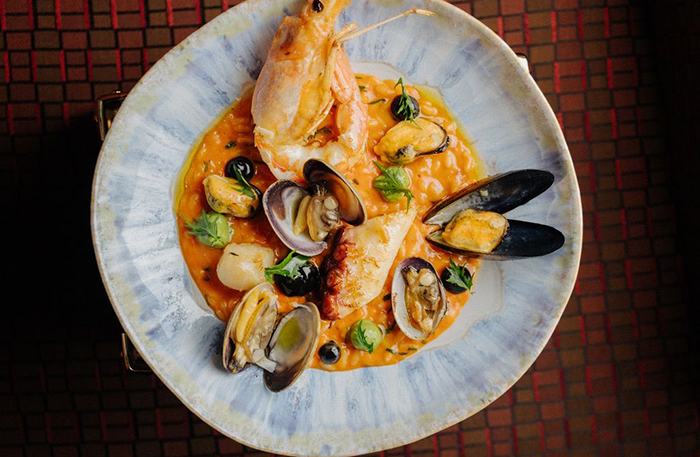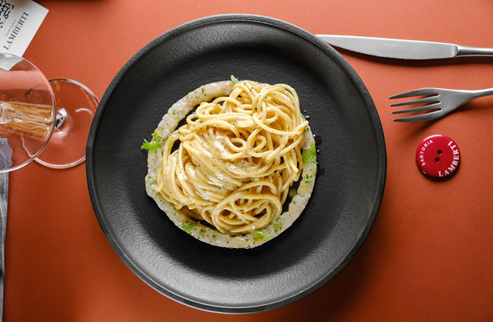 Что брать из еды? Пате из куриной печени (770 рублей) и тартар из говядины с бураттой и трюфелем (1650 рублей) — необычные твисты и идеальный баланс. Конечно же, паста! Любая паста от итальянцев будет прекрасна, а от Уиллиама Ламберти еще вкуснее. Тут представлено десять видов, просто лотерейничайте в любую. Я брала качо-э-пэпе в пикорино со сладкой креветкой (1430 рублей), а на соседних столах разглядела тортеллини из морепродуктов (1170 рублей) и зеленые тальятелле алла джановезе (990 рублей). С соседями я люблю разговаривать не меньше, чем с шефами, и они сказали, что очень вкусно. Взяла себе на заметку на следующее посещение. За модой тут следят: есть безглютеновая паста. Отдельный раздел меню посвящен блюдам из печи: тут всевозможные виды рыбы в различных вариациях — идеально для жаркого лета. От чего бы я воздержалась, так это от рулета с ягненком, его мучают в печи пять часов, а вкус и подача этого не стоит.