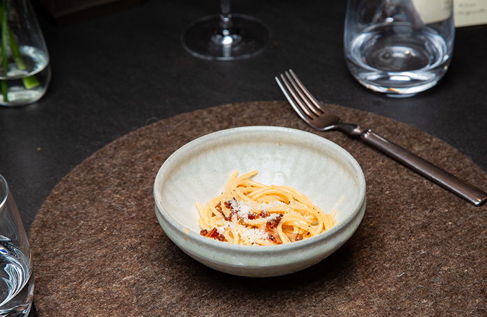 Паккери сменился спагетти карбонара, для этой пасты бекон запекают при температуре 100 градусов. Бекон получается хрустящим, но при этом сочным. Секрет вкусной карбонары тоже прост: ее варят альденте, потом перекладывают на сковороду, добавляют соус, и несколько минут паста прогревается вместе с соусом на сковороде на огне.