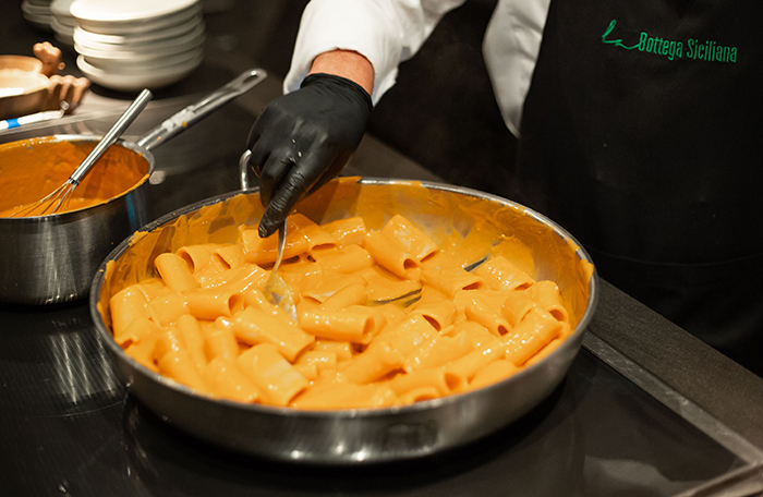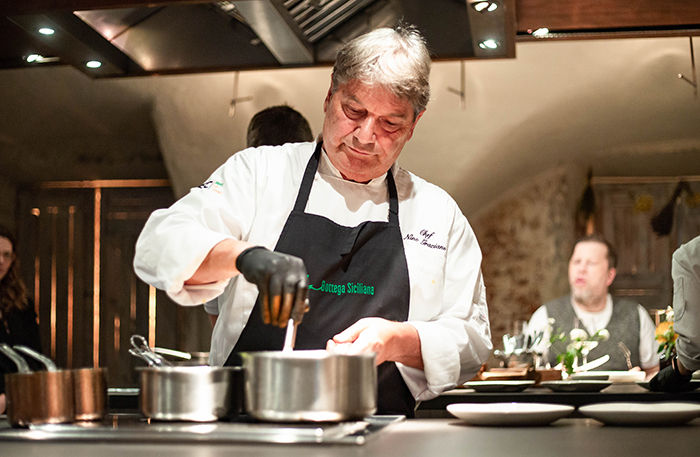 Зато вместо четырех рук нам достались сразу шесть жестикулирующих итальянских рук на сицилийский обед Cucina Tradizionale Elegante. Нино Грациано помогали два его ученика: Клаудио Пировано (шеф-повар Bottega Siciliana) и Лука Вердолини (шеф-повар Semifreddo). Смотришь на эту моложавую, улыбчивую итальянскую троицу и нестерпимо хочется иметь в своей крови итальянский ген и, желательно, итальянский паспорт.