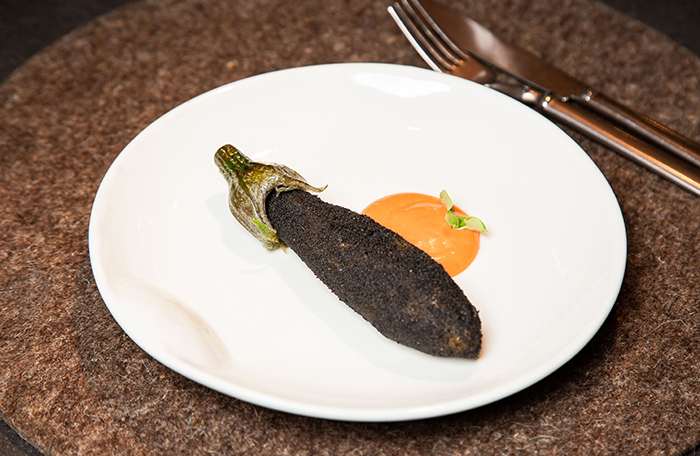 Amuse bouche (букв. «развлеки рот»): помидор не помидор и канноли не канноли. Про гастрономически-загадочный помидор мы писали ранее — его сделали специально для постного меню в 2021 году, а для сета реализовали мини-версию. Трубочки канноли тоже не сладкие и содержат в себе итальянскую капонату: баклажан, оливки, томаты, каперсы, лук, сельдерей и сицилийские приправы. От таких amuse bouche наш рот стал еще больше улыбаться.
