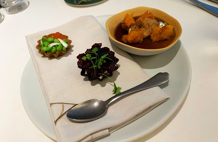 Аmuse Bouche задали тему сета — сезонные московские продукты и продукты, традиционные для сибирской кухни. Тарталетка с зеленым горошком, молодым сыром и икрой хариуса. Тартар из вяленой свеклы, грибов шиитаке, кедровых сливок и осетровой икры. В аккомпанемент закускам шла щавелевая содовая. В содовой обнаружены щавель, шпинат, лайм — она отлично аккомпанирует началу сета.