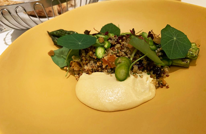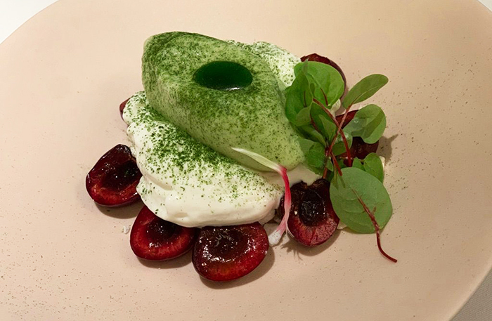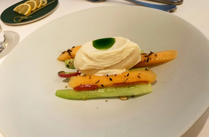 Из основных блюд отмечу салат из оранжевой дыни, огурца, мороженого из кокоса и тыквенных семечек в карамели от Артема. Скоро Москва начнет плавиться от летнего зноя, и такое блюдо будет спасением, его каждый может легко повторить дома. Наиболее удачное в сете блюдо Романа — спаржа с миндальным пюре с коджи (это тип японской закваски, изготавливаемой путем ферментации зерна) и гранолой из киноа с сушеной вишней и мюсли из орехов. Из десертов отлично было мороженое из эстрагона с домашним йогуртом и черешней — освежающее несладкое сочетание, только безе было жестковато.