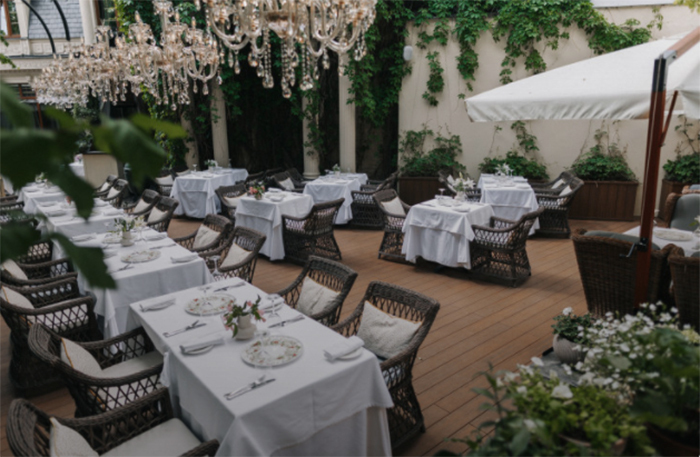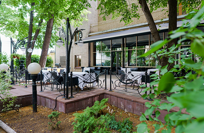 Regent подойдет для тех, кому важна приватная обстановка и при этом хочется оставаться в самом центре города. Здесь не одна, а две летние веранды. Советую занимать места на дальней террасе, там выход в приватный мини-парк. Он принадлежит гостинице, поэтому не ждите садов Семирамиды: советский парк, в глубине сломанный бетонный фонтан, цветы подвешены в дешевых пластиковых кашпо на фонарях, а ступени с веранды небезопасно шатаются из-за сломанных бетонных плит. Такая халатность, конечно, недопустима. Если на прогулку в парк не выходить, все равно спокойствие гарантировано.