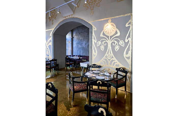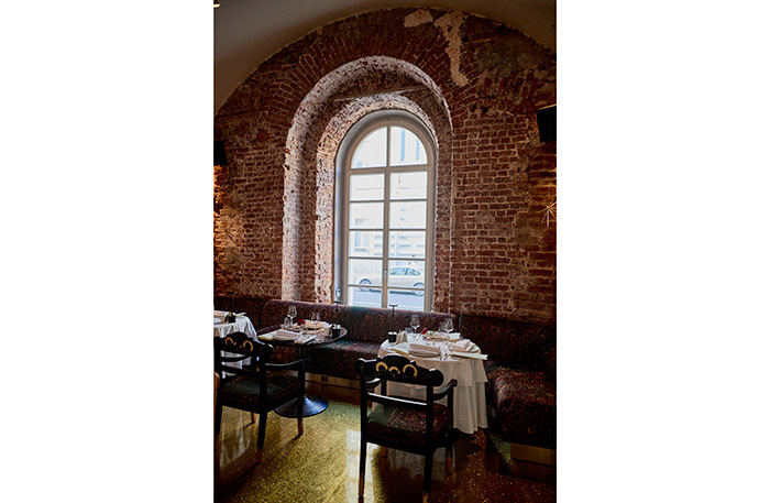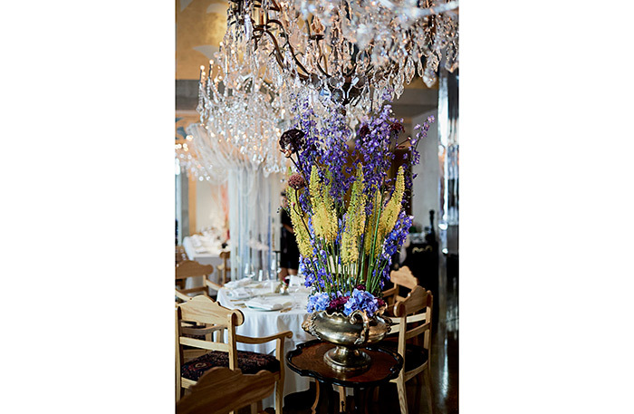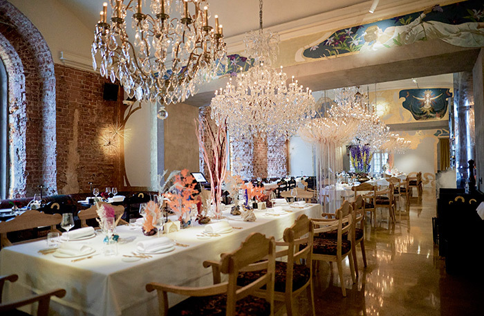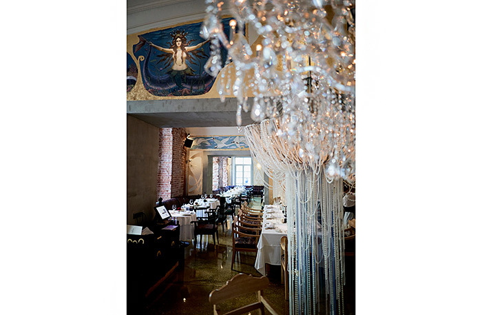 Это русская часть интерьера. Французскую часть представляют наряженные в парики морских цветов две очаровательные хостес в стиле Марии-Антуанетты, армия поваров в белых колпаках и официанты, униформу которых можно описать как «французский бордель». Добавляем к этой фривольности 140 видов шампанского в винной карте (кстати, алкоголь тут живет аж в трех картах: винная, бар и основное меню), настроение получается игривое, и хочется легких приключений. Если вы планируете сделать предложение и приятно провести романтический вечер, лучшего ресторана не найти — в таком антураже отказать невозможно. Для важных переговоров, мне кажется, этот ресторан слишком игривый.