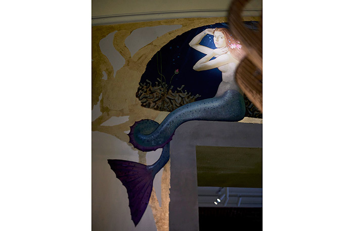«Гвидон» сделан в стиле коллекционного сборника русских сказок с золотым обрезом. Тут и росписи русалок, и переглядывание на фресках парубка с одной стены с девушкой на другой стене, и среднерусская листва, и персидские ковры, и дымящаяся сухим льдом витрина с чудо-рыбинами. Пол в виде золотого песка.