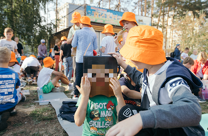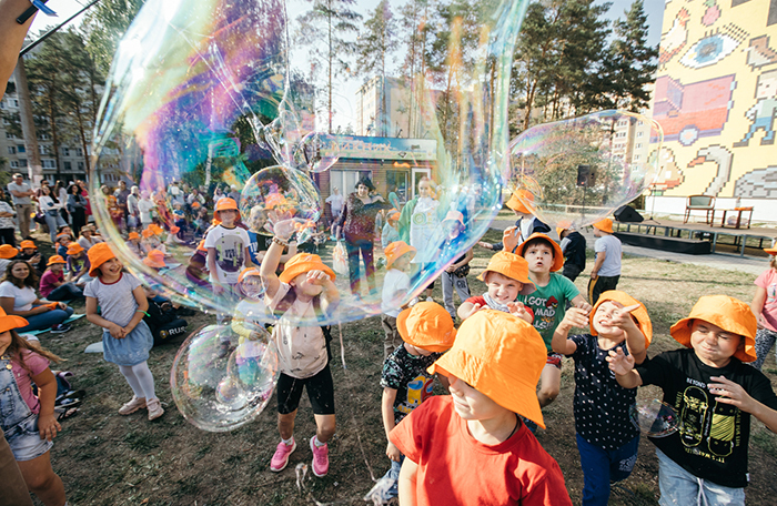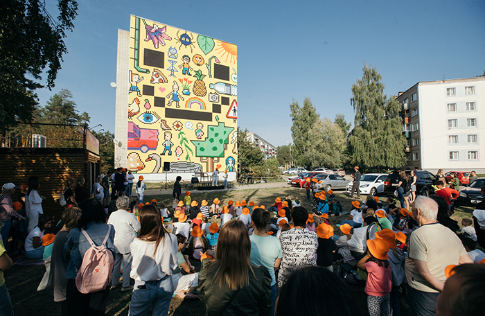 Еще одна фестивальная стрит-премьера — мурал «Смайл», первое детское произведение в коллекции уличного искусства Выксы. Как рассказывает его идеолог, художник Наталья Стручкова, «прежде чем создать роспись, мы с детьми совершили прогулку по улицам Выксы. Мы надели на головы коробки (на самом деле, маски героев «Майнкрафта») с квадратными прорезями для глаз. Задание было такое: посмотреть на мир квадратными глазами и увидеть в нем неквадратные предметы: круглые, треугольные и так далее. Все, что дети увидели, изображено на этой стене. Вот только самый первый увиденный предмет — «пузо дяденьки в магазине» — мы рисовать не стали».