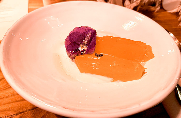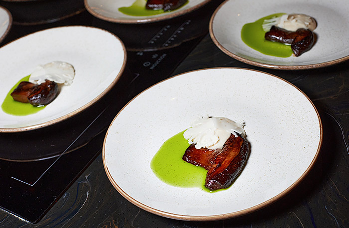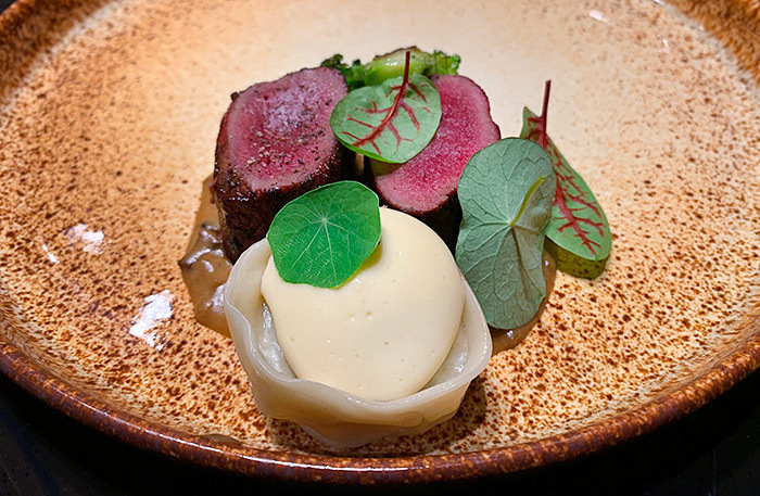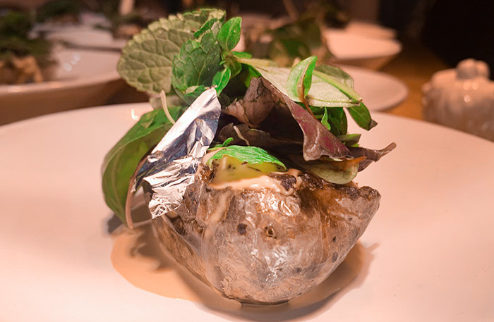 В блюдах простые ингредиенты, три-четыре компонента, но как он их сочетает — очень любопытно: «молодой сыр и хурма», «говядина, лисички, копченый чернослив». Очень тонко и вкусно. Много продуктов с утреннего рынка: что нашли интересного, из того приготовили: тарталетка «батат, пастернак, тыква», «томленое ребро ягненка с утреннего рынка». Ягненок был украшен маленьким кусочком пищевого серебра — трогательный акцент, чтобы вернуть нам детские воспоминания, когда мясо запекалось в духовке.