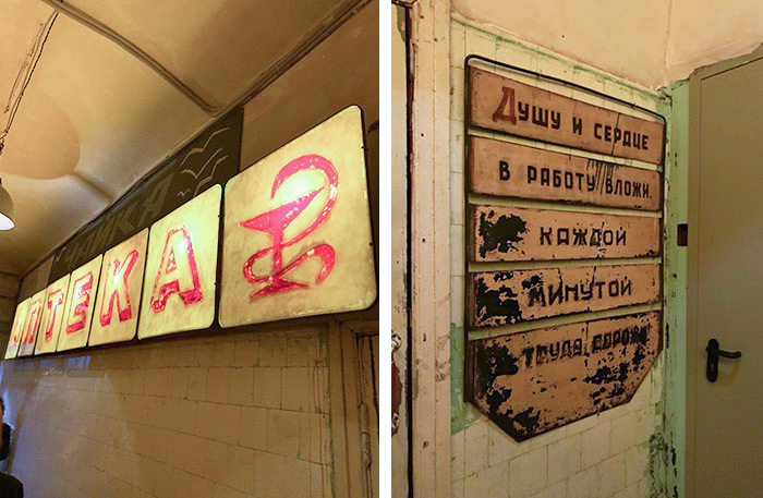 На проходной обычного советского завода вас встречают шампанским в качественном хрустале Riedel. Потом путешествие по территории завода, где среди «обшарпе и декаданса» вы еще немного перемещаетесь в Петербург — дома-колодцы с обсыпающейся штукатуркой и историческими вывесками.