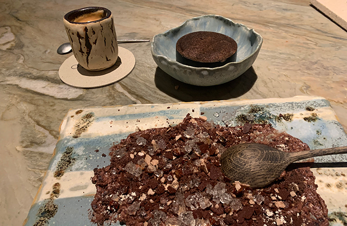 Посуду в Olluco привезли из Перу. Ее изготовили на заказ в мастерской null.lab в Лиме, она сочетает в себе одновременно космические и первобытные формы. Именно когда я разглядывала посуду, у меня возникло ощущение, что я попала к шаманам.