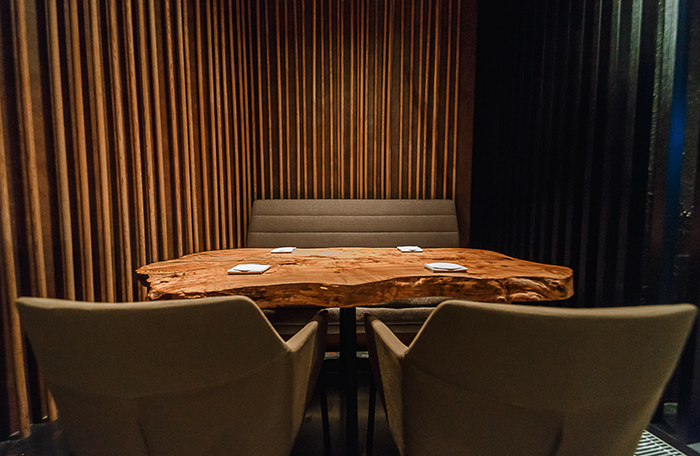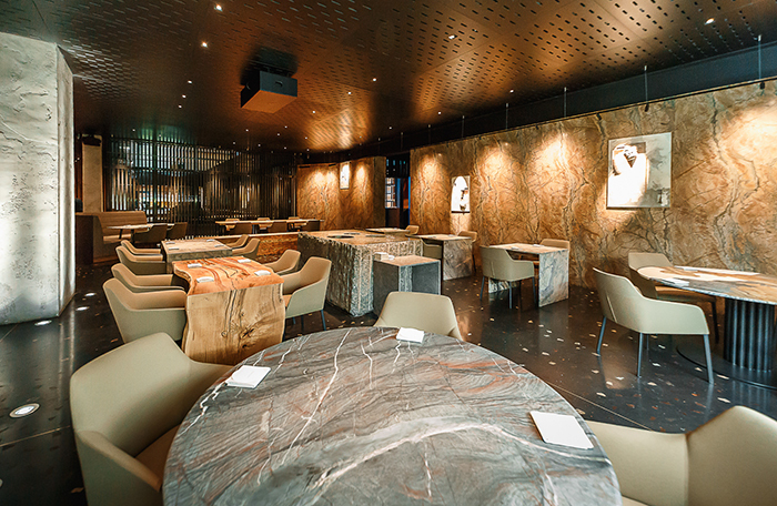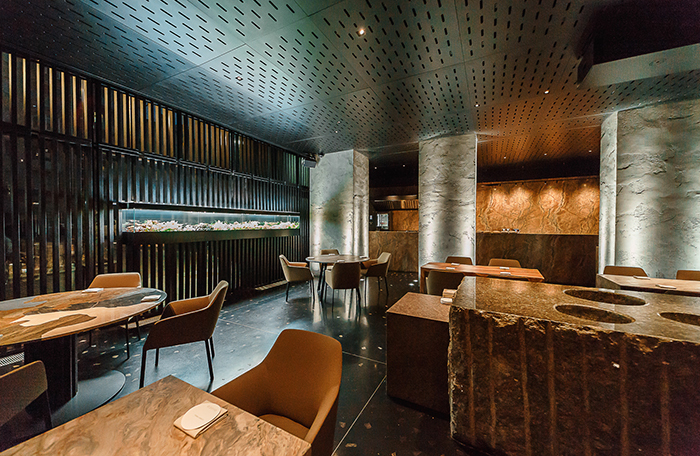 Каменные столики гостей поставлены настолько далеко друг от друга, что кажется, вы на разных планетах. Посередине зала камин причудливой формы. По стенам — винные шкафы, в космических окошках которых горизонтально расположены подборки из вин, причем к российскому вину тут относятся с особым трепетом. Центральная барная стойка, словно упавший метеорит, — глыба из целикового куска гранита с характерными трубчатыми следами сверления.