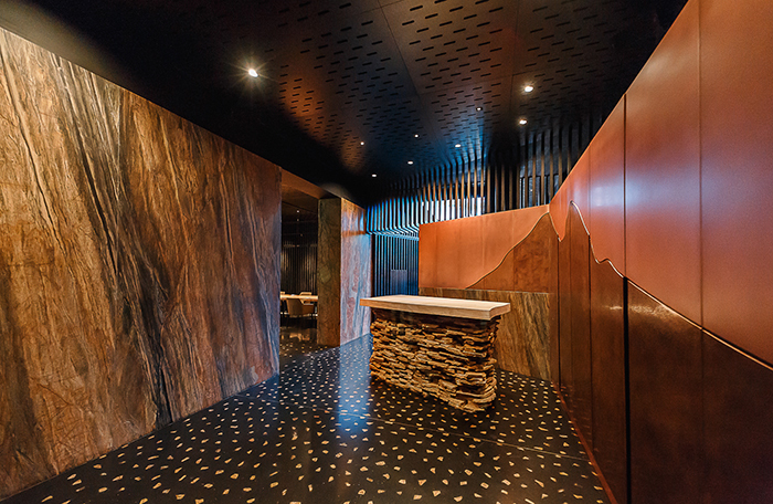 Во всем пространстве стены отделаны гигантскими слэбами натурального коричневого бразильского кварцита. Приглушенный свет. Персонал, словно в спа-салоне, движется мягко и бесшумно. Стены Olluco украшают таинственные картины перуанского художника Исмаэля Рандаля, они созданы из почв Перу, собранных с разных высот и смешанных с бетоном. Я не была в Перу, поэтому мне все кажется совершенно потусторонним, загадочным духом далекой страны, родины инков. У инков скалы, горы, пещеры, утесы и ручьи играли важную роль в религии, многие из них считались священными. Поэтому ощущение, что вы в каком-то древнем перуанском храме, будет сопровождать вас все время.