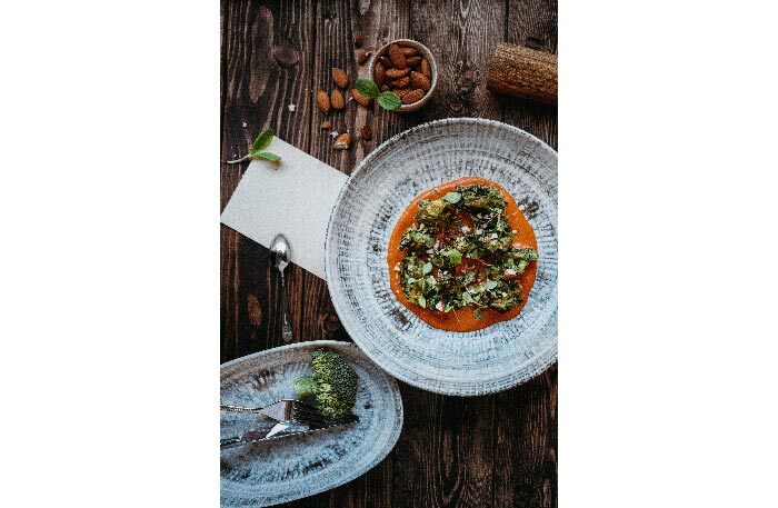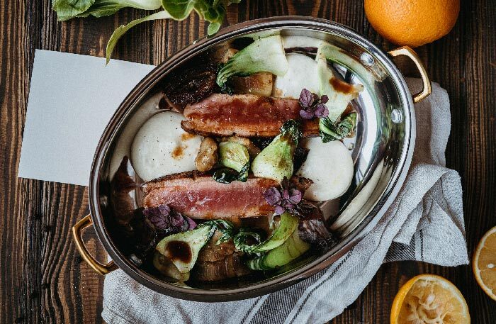 Из холодных закусок берите капонату с белой рыбой, вителло тонато со спаленными овощами и, конечно же, домашний сыр буррата с копченым тунцом. Все это можно есть отдельно, а можно собрать в брускетту. Копченого тунца и бурраты я попросила добавки. Запивать предлагаю либо лимонадами собственного производства («красный апельсин с лавандой» и «красный апельсин, персик и ройбуш» мои фавориты) или вином, выбор которого и по бокалам, и по бутылкам велик.