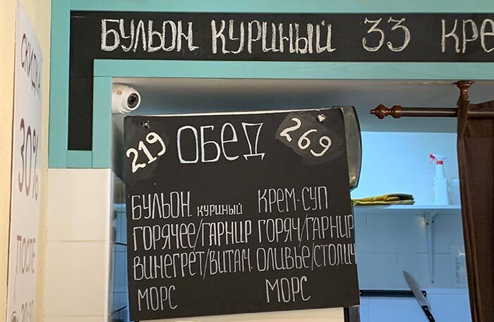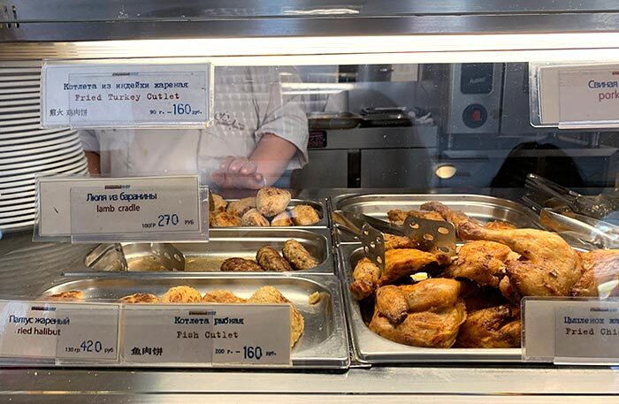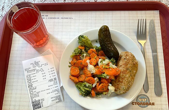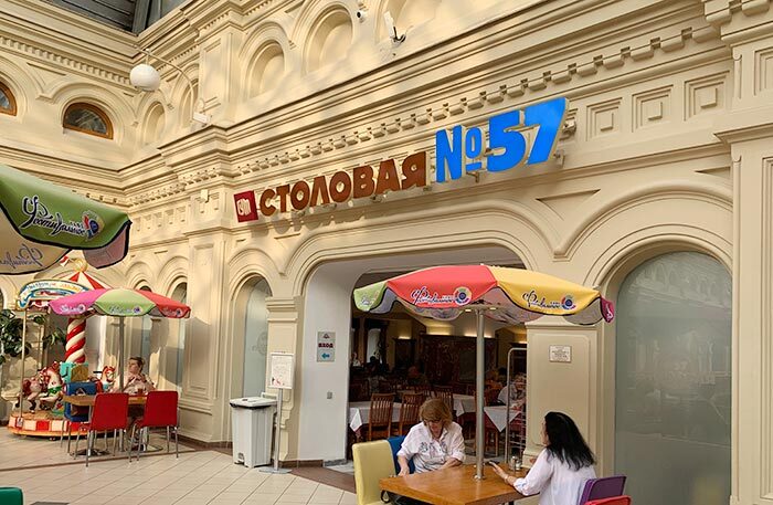 Столовая № 57 в ГУМе. Да-да, в ГУМе есть столовая. Третья линия, третий этаж, очередь туда даже в будний день такая же, как была в обед выходного дня в кафе IKEA: хвост наружу. Кружевные клеенчатые скатерти — роскошь из нашего советского «нарядного». Обед обошелся мне в 410 рублей. За рамки бюджета меня вывел соленый огурец за 60 рублей (не могла удержаться) и морс. Рыбная котлета, хоть и холодная, была хороша.