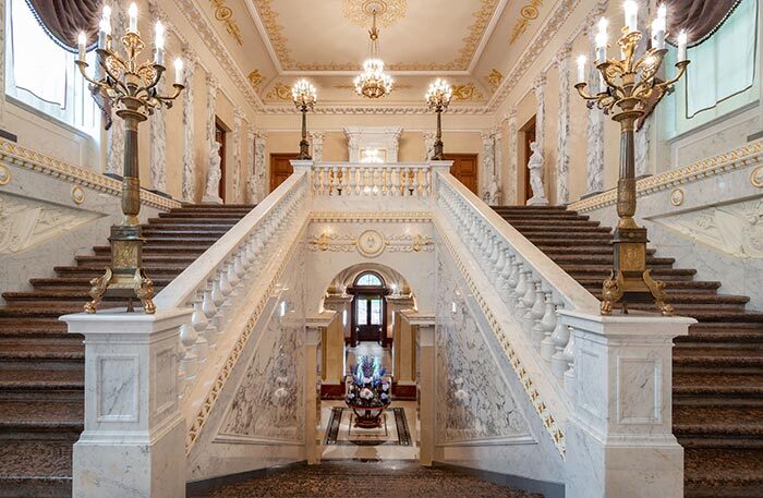 В этом гастрономическом обзоре решила рассказать не только про гастрономическую программу, но и про культурную, тут важно достроить образ роскошного. В современном Петербурге практически все плачет от вандализма советских дней, когда побелку заливали дешевой масляной краской, а лепнину сбивали со стен, чтобы обои легче клеить было, в центре до сих пор полно коммуналок, а в некоторые парадные и дома страшно зайти. Но все же есть в Петербурге места, помимо Итальянской галереи Эрмитажа, где можно окунуться в минимально тронутую дореволюционную эпоху.