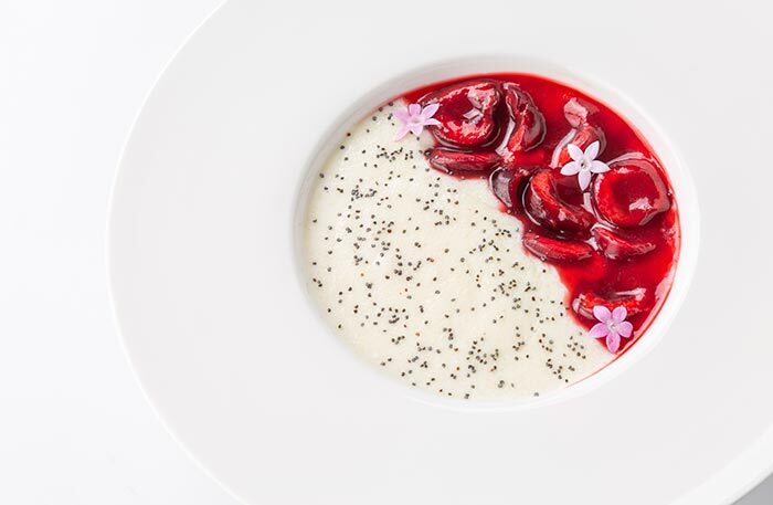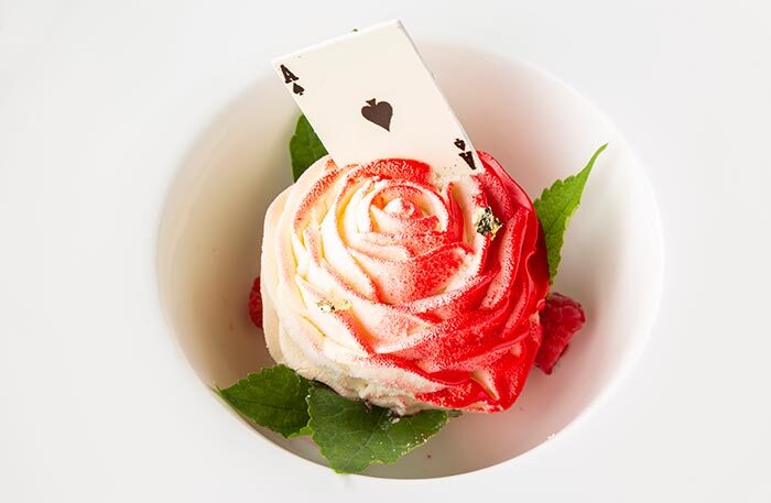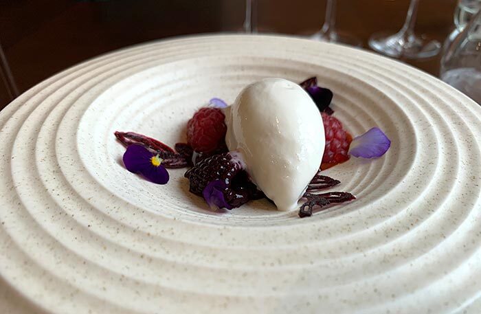 В этот раз в блюдах Артем так тонко выстроил вкусы, что мне даже не к чему было придраться, это его лучший сет. Отдельно отмечу мастерство шефа обращаться с гребешком, пожалуй, у него самые вкусные гребешки в двух столицах: Артем понимает гребешок, а гребешок понимает Артема. Завершается сет десертами-впечатлениями. Ягода красника, которую Алексей привез с Камчатки, переработана в сорбет и дополняется супом из ревеня, внутри которого обнаруживаются прозрачные пластины желе из лайма, — «Формы воды», так я мысленно назвала этот десерт. Второй десерт картинно красивый и обыгрывает вкусы малины и свеклы. Если вы пробовали знаменитый десерт Алексея «свекла-малина», то десерт в сете — это шаг вверх.