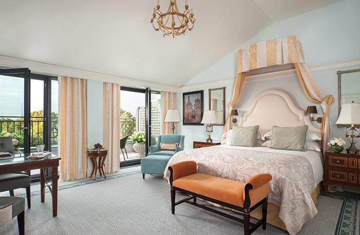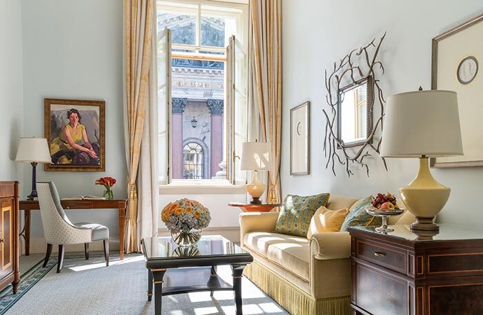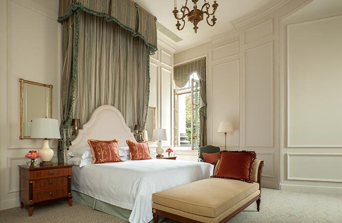 В просторных номерах роскошные ковры, над кроватью бело-желтый балдахин, на стенах старинные гравюры, камеи и картины, а двухстворчатая дверь в просторную мраморную ванную комнату напоминает вход в шкаф-Нарнию.
