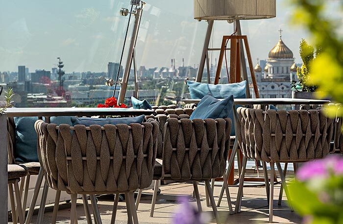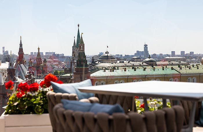 Я, конечно, попросила показать мне президентский номер. Зрелище впечатляющее, стоимость номера — 1,5 млн рублей в сутки. Такой номер могут себе позволить, наверное, только шейхи, а вот обед или коктейль на самой знаменитой крыше Москвы — вполне реальная фантазия. В отеле есть спа, но в халате на веранду не пустят: просьба соблюдать дресс-код.