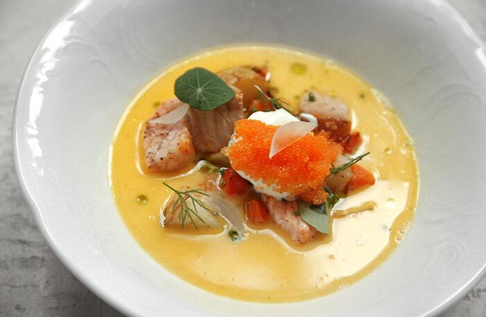 В московских отелях рестораны, которые управляются самим отелем, достаточно большая редкость, но Shagal на первом этаже Mоvenpick — как раз такое исключение. Шеф Виталий Баранов молодой, но за пять месяцев, что я за ним наблюдаю, видно, как шеф растет. Кухню называют авангардной, но вкусы очень понятные, а меню сезонно обновляется: сейчас стоит заглянуть на суп из цветной капусты с камамбером, на свежайшие гребешки (особенно хорош гребешок с тапиокой и кешью) и необычный палтус с палтусовой икрой, муссом из цукини и соусом из рапанов.