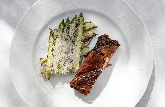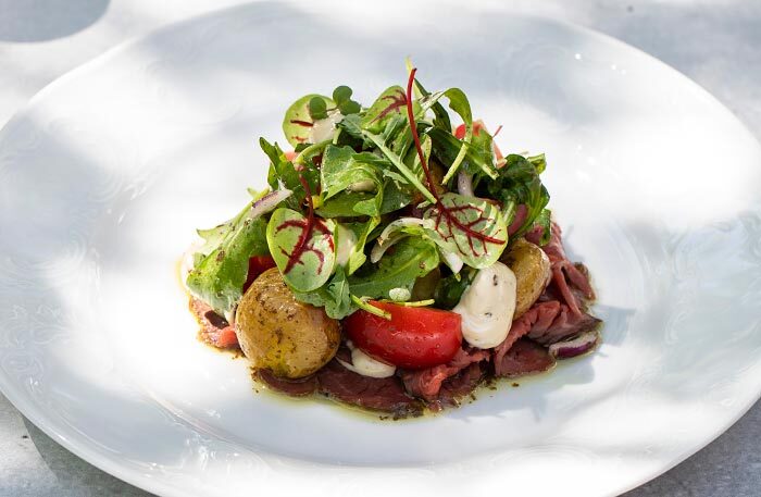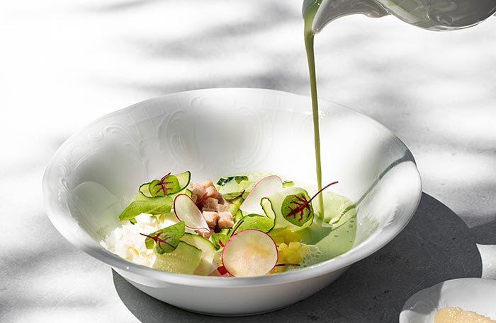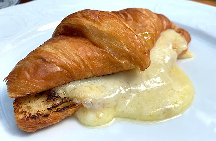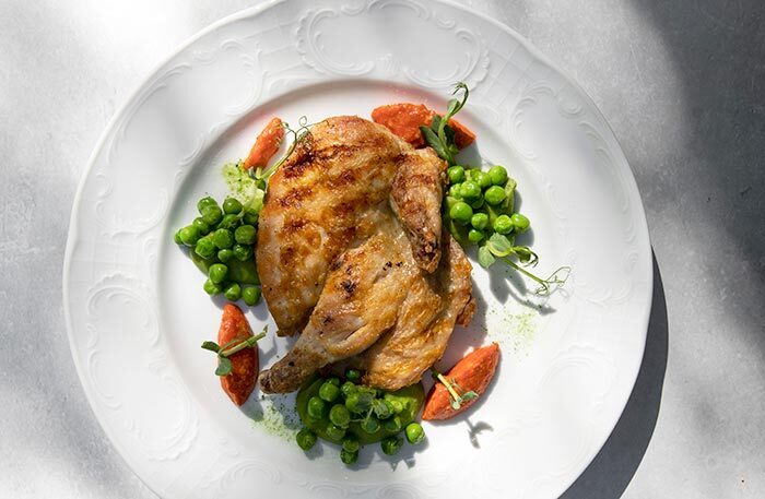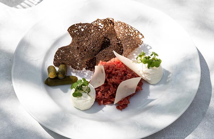 Меню в ресторане «Библиотека» простое и понятное. Говяжья щека с пюре, окрошка, цыпленок. На закуску черешня, на десерт шоколадная колбаса из детства. Чаи фантазийные: «Вишневый сад», «Сны Достоевского» и «Мятный лев», мяту для которого собирали на огороде Толстых в Ясной Поляне. Завтраки готовят на гриле, плавят сыр раклет: невозможно отказаться от круассана с раклетом и картошечки с раклетом, лисичками и яйцом пашот.