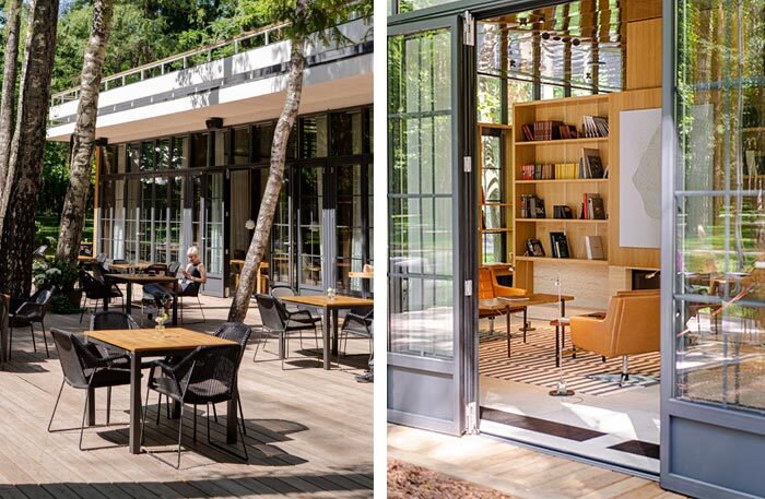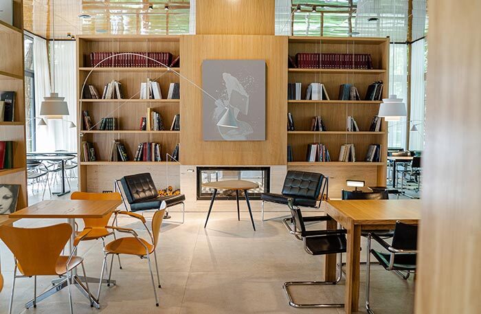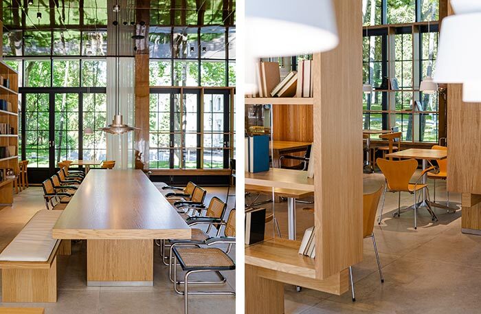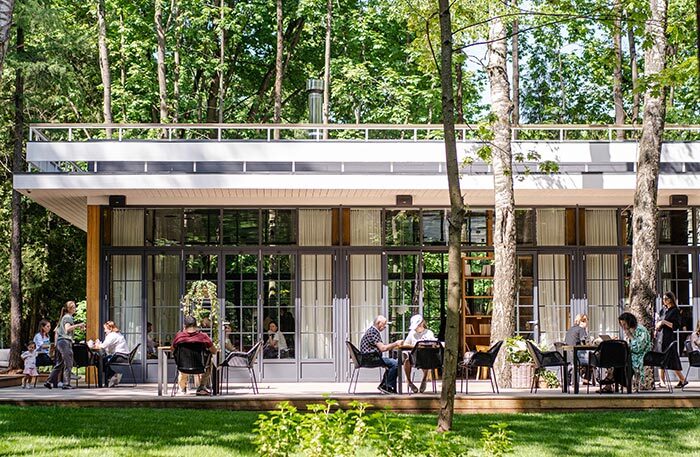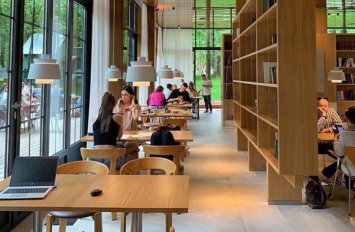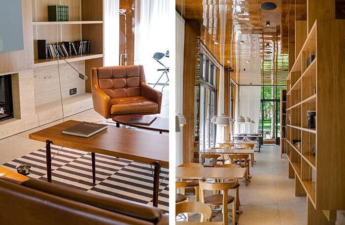 На десерт отдаю мое самое любимое место этого сезона — писательский поселок Переделкино. Вам тоже представляется неторопливый уклад летней жизни, бесконечные чаепития и прогулки по лесу? Если вы такая же романтичная натура, как и я, рекомендую вам отправиться в новый ресторан «Библиотека». Он недавно открылся на территории Дома творчества писателей. Ресторан состоит из двух частей: огромного зала с библиотекой и веранды.