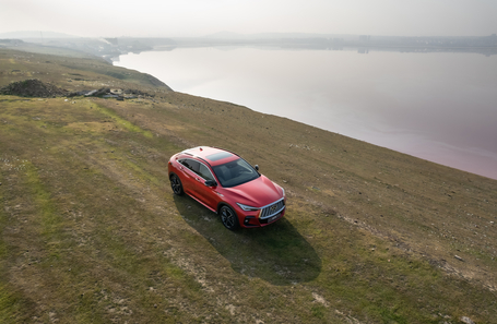На этот раз у меня кросс-купе Infiniti QX55, в мягком красном цвете. Ниспадающая линия крыши, контуры решетки радиатора с узором в стиле оригами, высокотехнологичная LED-оптика и базовые 20-дюймовые легкосплавные диски явно задают тон слишком динамичной поездке.