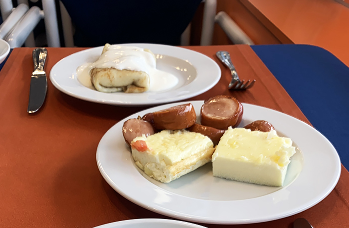 На обед и ужин блюда были небольшие, но сытные. Иногда меня поражала фантазия теплоходных поваров смешивать в одном блюде яйца, майонез и ананас. Но такие гастрономические диссонансы компенсировались вежливым приветливым персоналом в зале и нереально вкусной картофельной пюрешечкой с котлетками.