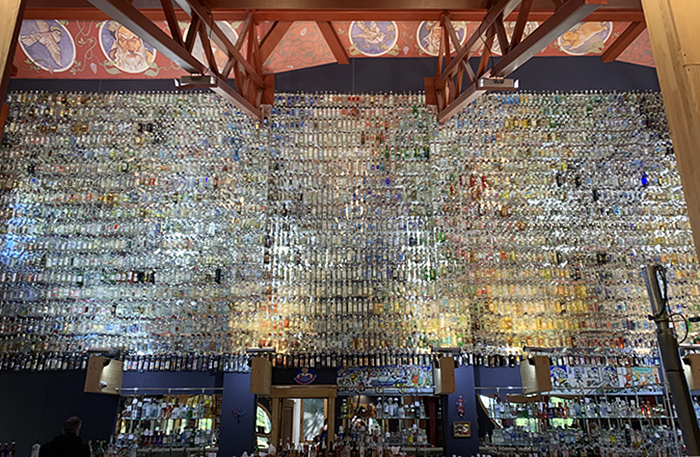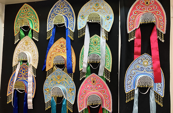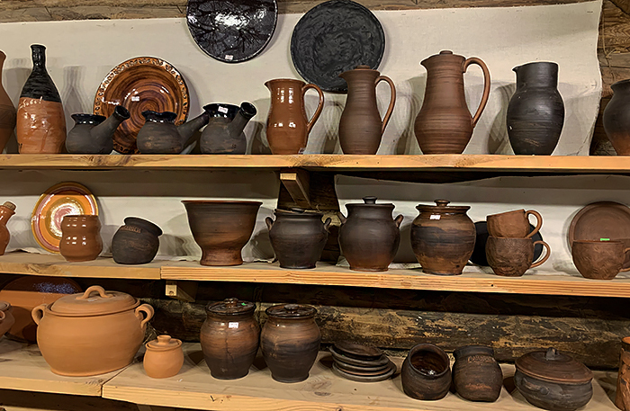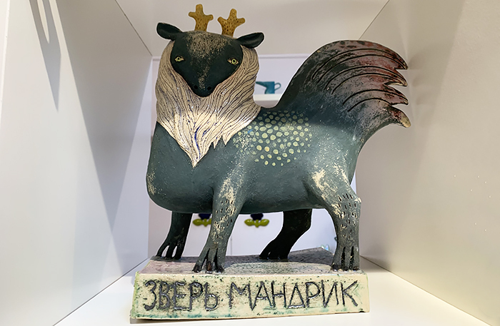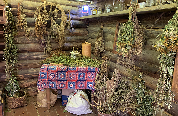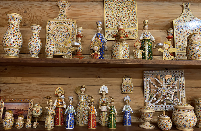 В левой части деревни построили магазины с сувенирами: павлопосадские платки, матрешки, карельские вышивки, кокошники и ростовская эмаль. Есть «Музей водки» — в его коллекции четыре тысячи бутылок. Вход 300 рублей, в билет входит дегустация водочки количеством одна стопка. Я водку не пью, но масштабом коллекции и росписями терема впечатлилась.