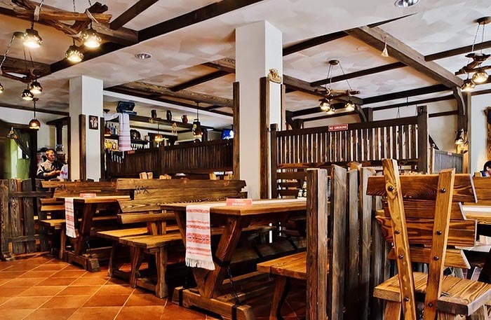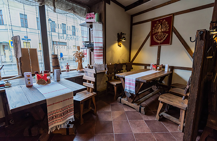 «Белорусская хата» оформлена в виде сельского домика. Светлые стены и потолок, массивные деревянные балки. Украшением служат бело-красные рушники, кувшины, плетеные из соломы куклы и фигурки. Добротные стулья. Каждый стол огорожен заборчиком, так что вы словно во дворе в настоящей деревне.