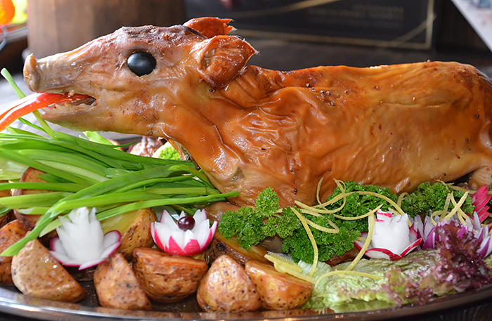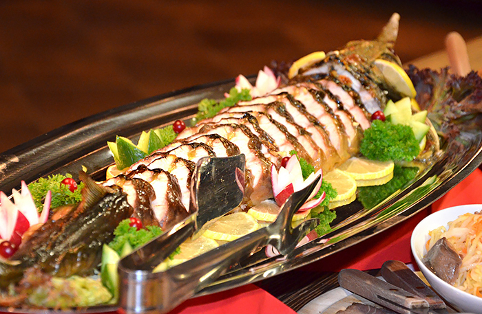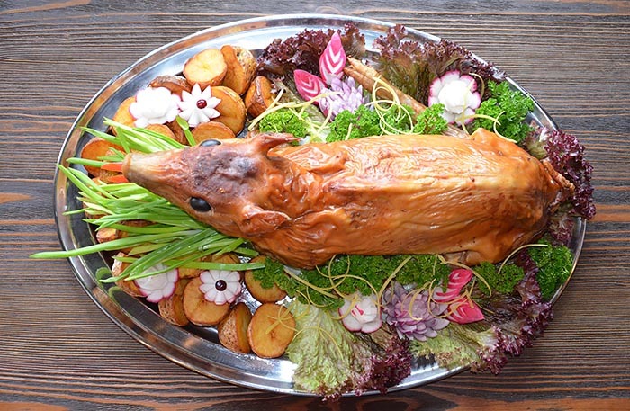 На первое варят деревенскую уху, сборную солянку, белорусский борщ. Для основного блюда на троих выбирайте запеченную рульку, а на компанию — «белорусский гостинец» из трех видов мяса с картошкой.