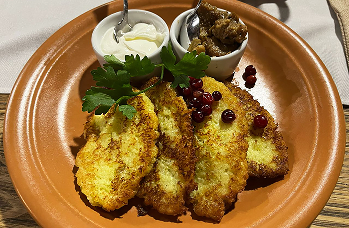 В меню ожидаемо много блюд из картофеля: колдуны, драники, скоблянка. Драников тут 13 видов: классические, с телятиной, со шкварками. Есть богатый драник «князя Радзивилла» с яйцом, жареным луком и красной рыбой. Есть необычный драник в горшочке с телятиной и черносливом. Драники тут пышные, жирненькие, а порция — огромная.