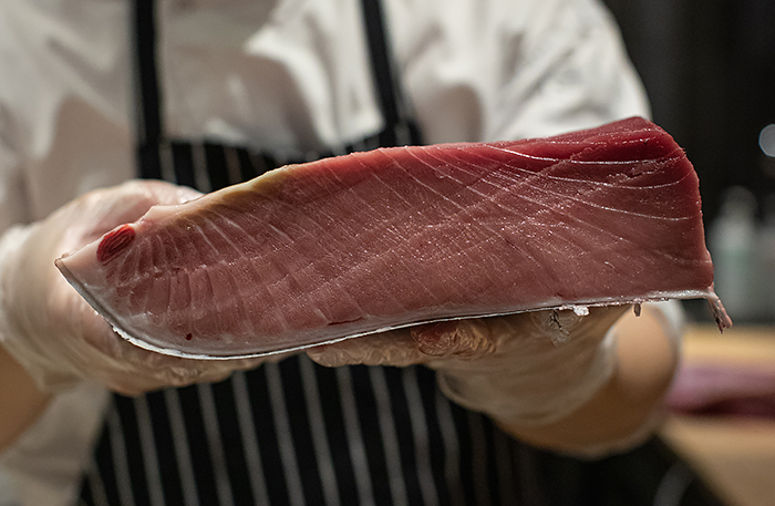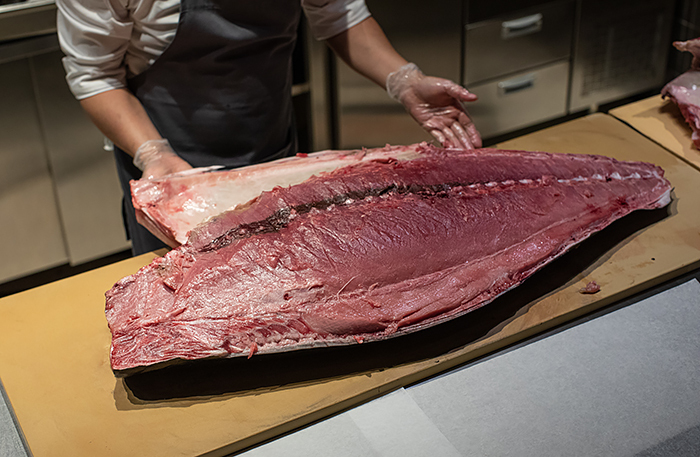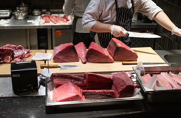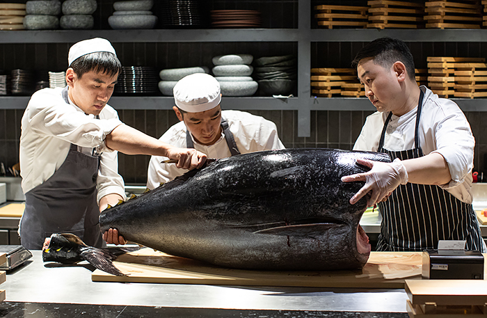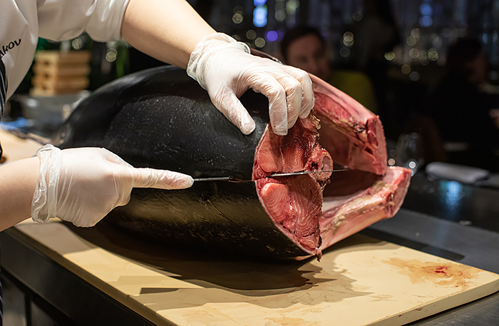 Даже такой мастодонт, как Novikov Restaurant & Bar на улице Тверской, дом 3, интерьер в стиле «красно-черный лакированный поднос» и привычные развалы с овощами поменял на элегантный ресторан в стиле minimalist luxury. На прошлой неделе я присутствовала там на разделке 80-килограммового тунца и специальном меню из этого малыша. Обещают такое шоу сделать традицией.