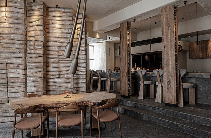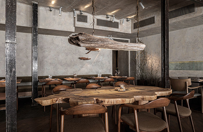 В ресторане два этажа: первый символизирует землю, огонь и воздух, а второй, точнее минус первый, подземный, в котором скоро откроется бар, — отвечает за стихию воды.
