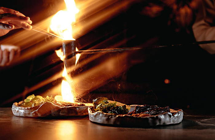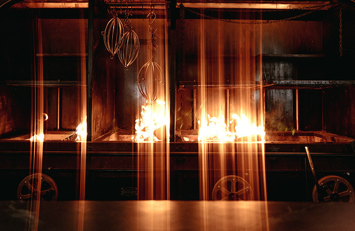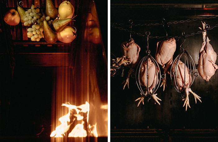Огонь вообще играет важную роль в «Айне»: есть модная осовремененная русская печь и гриль необычной красоты. Очаг, древнейший символ дома и семьи, здесь стал главным инструментом шефов: над очагом подвешены и пропитываются приятным дымком виноградные гроздья и целиковые курицы — все это элементы блюд.