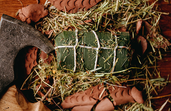 Подкопченный виноград окажется в салате, а куриную ножку вы получите со всеми пальчиками. В глиняной обвалке, в сене и в камышовых листах в печи запекается голубец с осетриной: мне не хватило дымка, сено тут как «теплоизоляция», и лист камыша не пускает запаха в голубец, у самого голубца слишком рыбный вкус. Зато мне очень понравилось тесто для чебуреков и краснодарская аджика к ним: я с нетерпением жду, когда начинка будет не только из модно-московского краба, ведь такое вкусное нежирное тесто просто просит экспериментов.