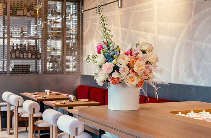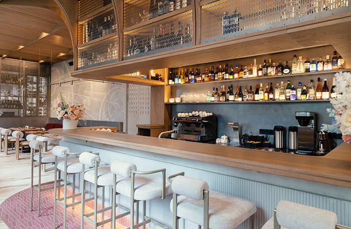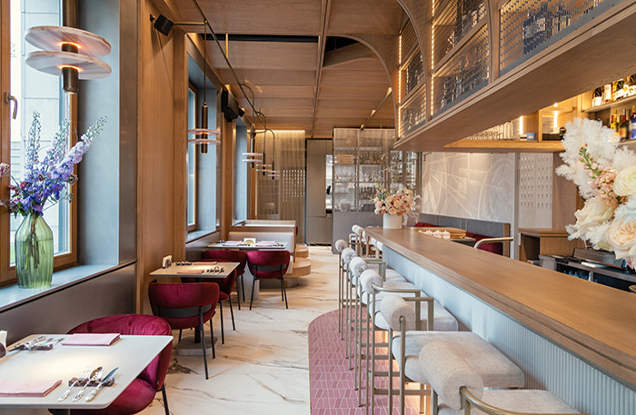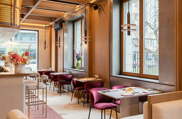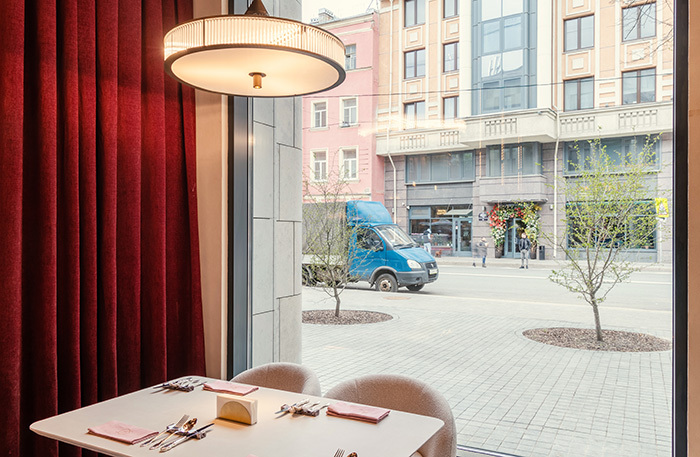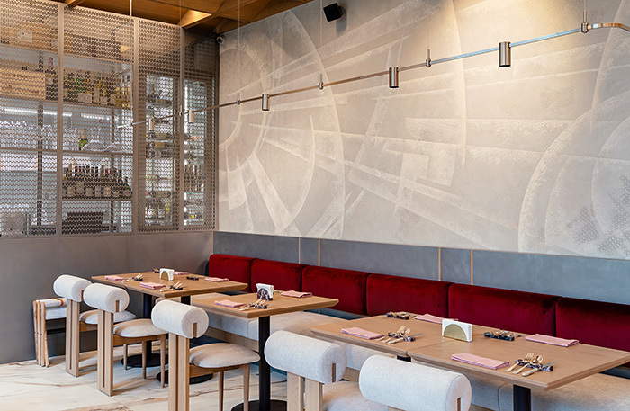 В зале светло, воздушно, переливы светло- и темно-серых оттенков на стенах в какой-то момент складываются в футуристический узор, которым славился русский авангард, — лично я разглядела аллюзию к «Планетному супрематизму» Эля Лисицкого. Светильники-Юпитеры пока в дороге и, как доедут, заменят нынешние, зато вся поверхность барного стола — бесконтактная подзарядка, что, с одной стороны, инновационно, а с другой — очень актуально.