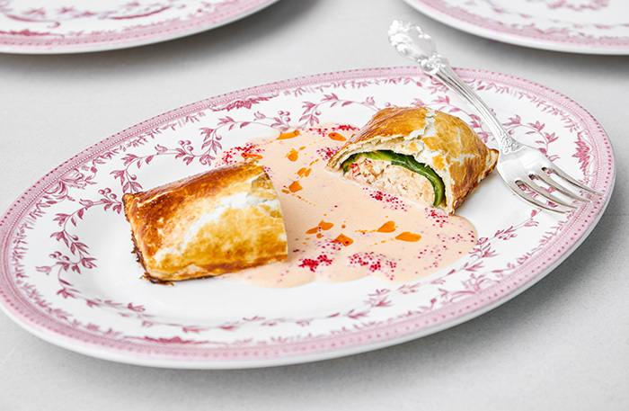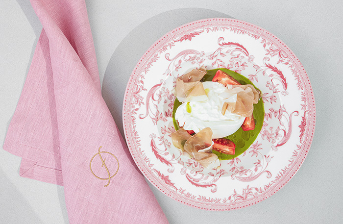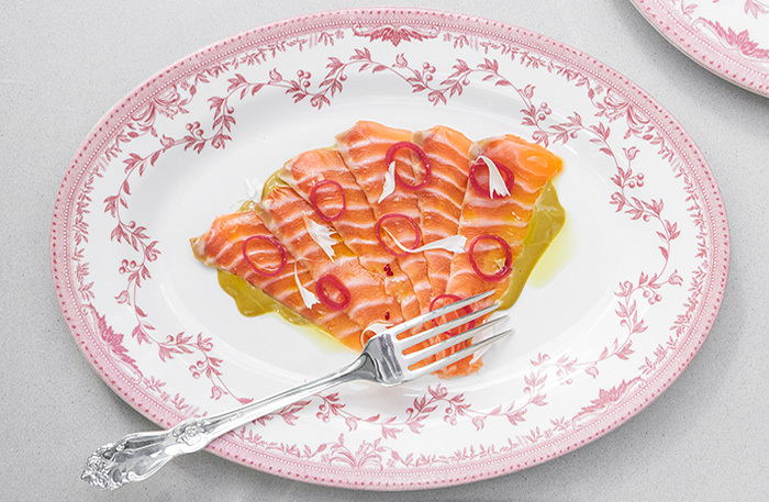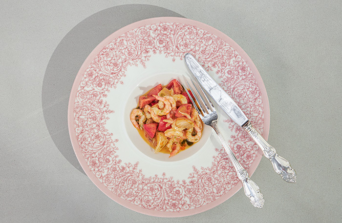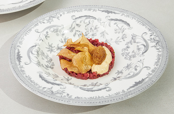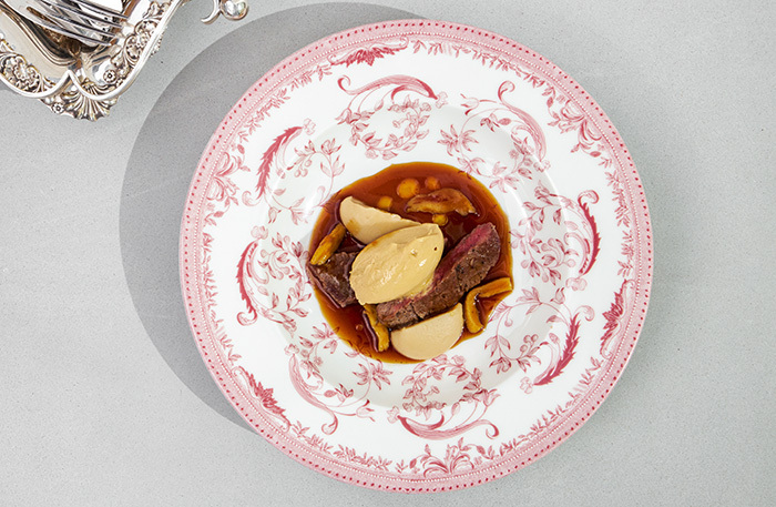 Есть повод насладиться эстетическим подходом к деталям сервировки, я воочию увидела то, о чем мне недавно рассказывал операционный директор Антон Нечипоренко: тарелки с рисунком решетки Михайловского театра и узором с лоджий Рафаэля в Эрмитаже — 11 лет их копировали с Папского дворца в Ватикане. Столовые приборы с орнаментом-розочкой как дань нашему детству, подставки под приборы из красного и зеленого мрамора — словно из Мраморного дворца. И самые красивые подставки под сумки, которые я видела в ресторане, — девушки, про нас тут очень подумали.