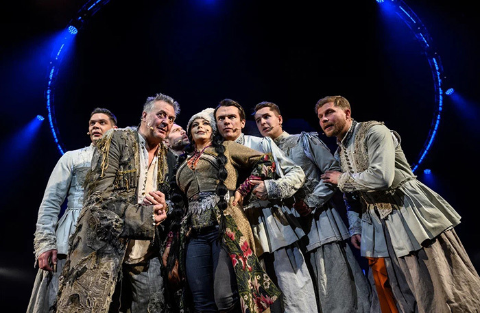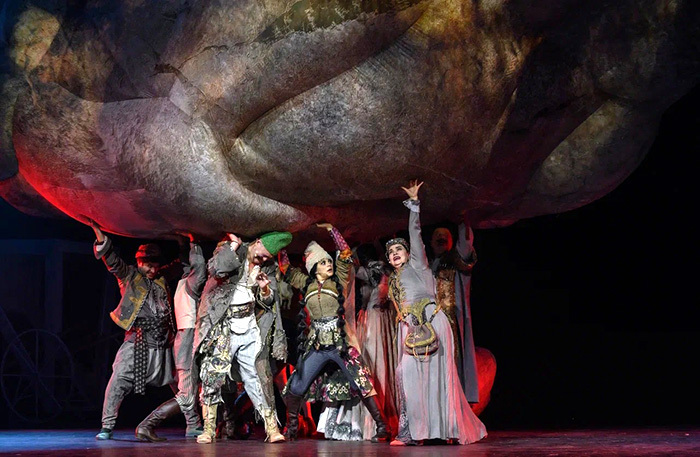 Трехчасовой спектакль получился ярким, динамичным и немного наивным — вспоминаются картины Пиросмани. Огромные декорации, как любит Крамер, постановщик красочных шоу, много национальных танцев, пения а капелла (хотя надо делать скидку на то, что это все-таки драматические артисты). Герои будто бы персонажи мультфильма. Ханума — Пегова спускается на сцену на воздушном шаре в форме хинкали, раздает свои визитки зрителям и рассуждает о преимуществах жизни замужних и женатых. Хотя самой ее героине «замуж сходить некогда». Для Ирины Пеговой работа над этой ролью во многом шла на сопротивлении: