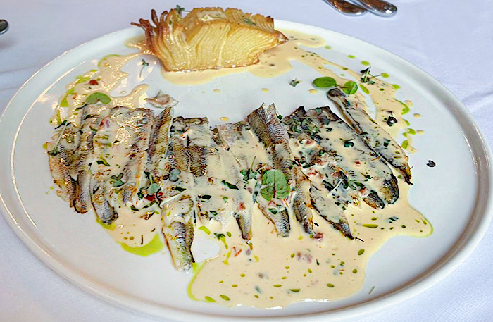 Блюдо корюшка впечатление не произвела, а вот гратен к ней хорош. Лосось «Труагро» — нежнейший, идеальной степени готовности.