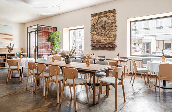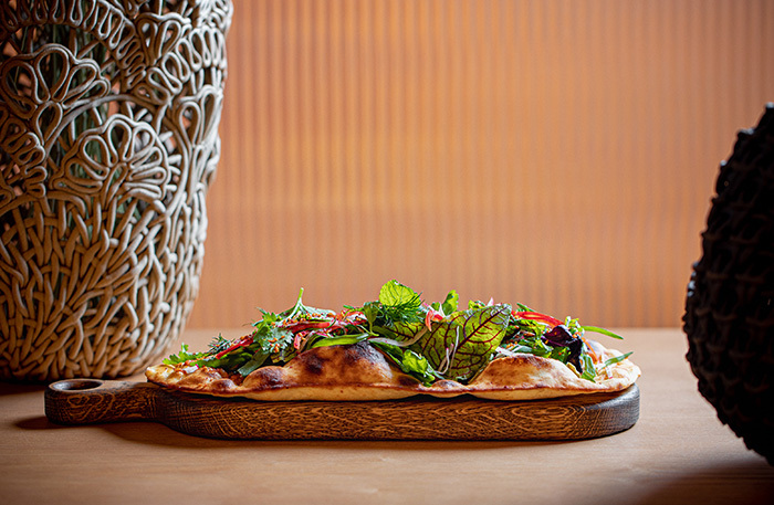 На открытой кухне, расположенной на подиуме-сцене, соседствуют хоспер, дровяная печь и гриль робата. Одно из главных блюд — пицца персиана — напоминает тот самый лахмаджун из Folk, но начинки свежее и интереснее, для сетевого ресторана это однозначно будет хит. Персиану делают из теста, которое ферментируют двое суток. Потом выпекают лепешку, щедро посыпают бараньим фаршем с мухаммарой и горой — правда горой — ароматной зелени. Есть персиана с кальмаром и сморчками.