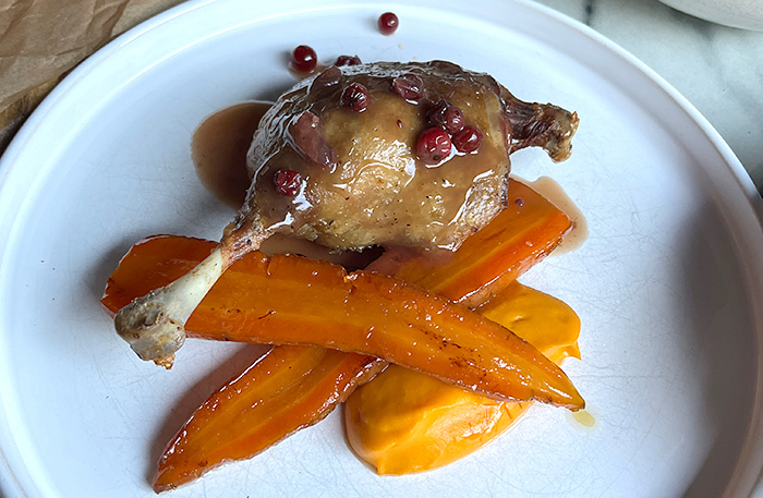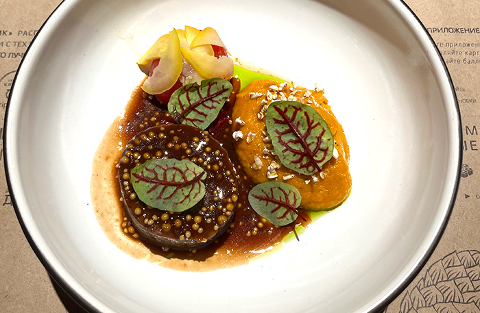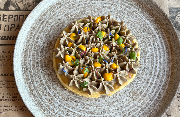 Ферментация и эксперименты. Дмитрий стажировался у Игоря Гришечкина в Cococo, у Артема Естафьева в Artest, наложил техники на региональные продукты и получился мусс из картофеля с копчеными перловицами (пресноводный моллюск, который водится и в Рязанской области), судак в соусе из ферментированного огурца с древесными грибами и идеальная по мягкости и прожарке утиная грудка рязанской прописки с пюре из моркови и соусом на сыворотке. На десерт — крем на можжевельнике с соусом из сосновых шишек. Шеф сам их собирает в лесу. И еще тут самая вкусная пицца в городе — ее делают на тесте 72-часовой выдержки.