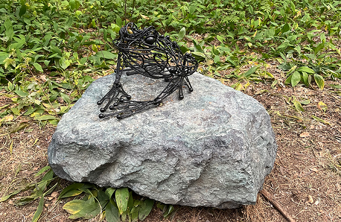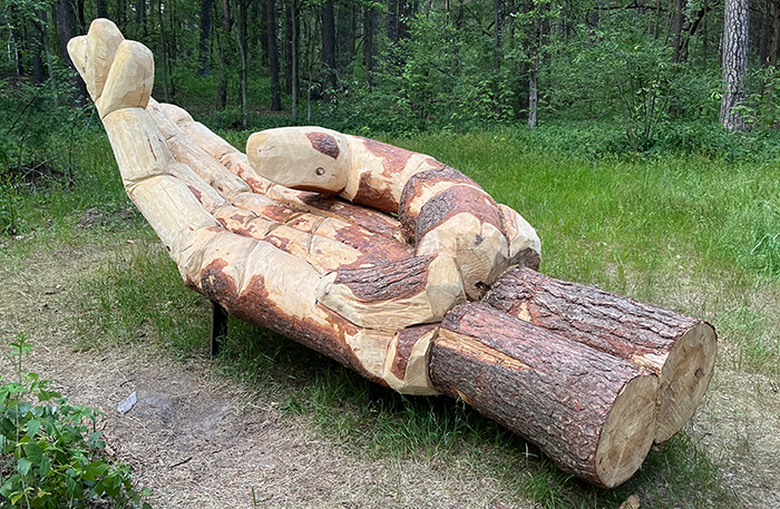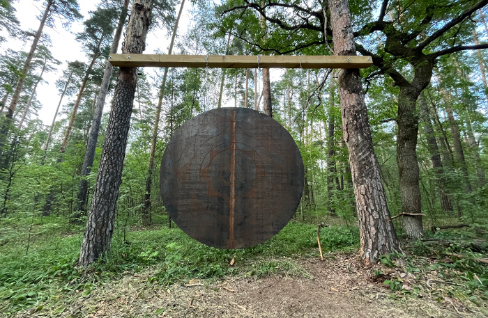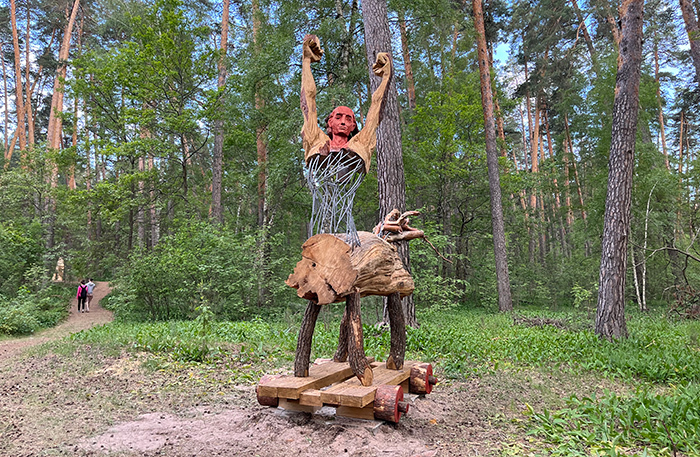 Напротив монастыря, через дорогу, начинается тропа Паустовского, место, которое я настоятельно рекомендую посетить всем. Бесконечно красивый сосновый лес, в мае тут море ландышей, а сейчас можно идти по песчаным дорожкам, наступая, как в детстве, на корни-коряги. Тропа имеет несколько вариантов маршрута, от семи до 50 километров, и сейчас ходить еще интереснее: вдоль троп выставлены 20 арт-объектов: рыбак, мифическая женщина-индеец-кентавр, царевна лягушка и гигантский шаманский железный бубен, в который можно бить всем.